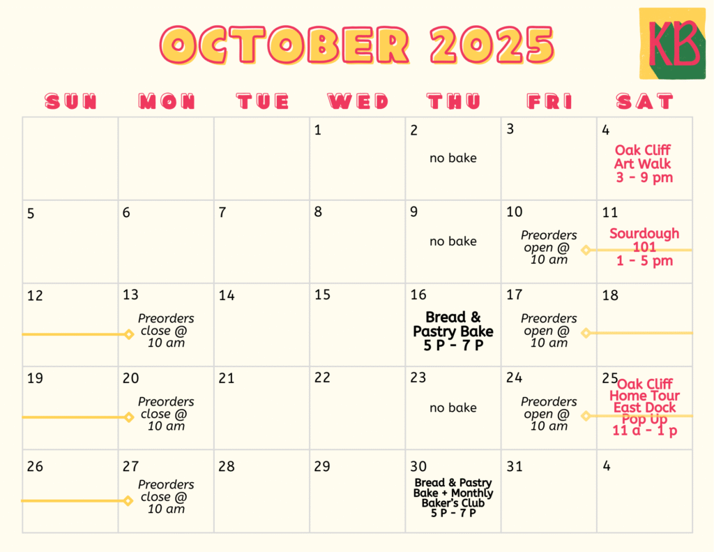 Preorders are open Friday at 10 am – Monday at 10 am for pick up on Thursday from 5-7 pm or porch pickup afterwards. Pickup is at our cottage bakery in North Oak Cliff near Bishop Arts District. Please check your email (or spam folder) for your order confirmation with pickup instructions.